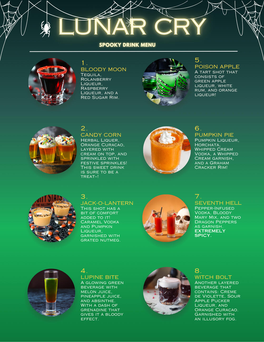 The upstairs of the Lunar Cry holds a bar centered around jazz & rock vibes, with various trinkets along the walls and on display. The upstairs lounge is meant to be on the more relaxed side, with a dimmed atmosphere and open seating for those who visit. At the back of the room would be the stage! Various events take place in the upstairs of the Cry, though centered around our most common; Open Mic Nights.